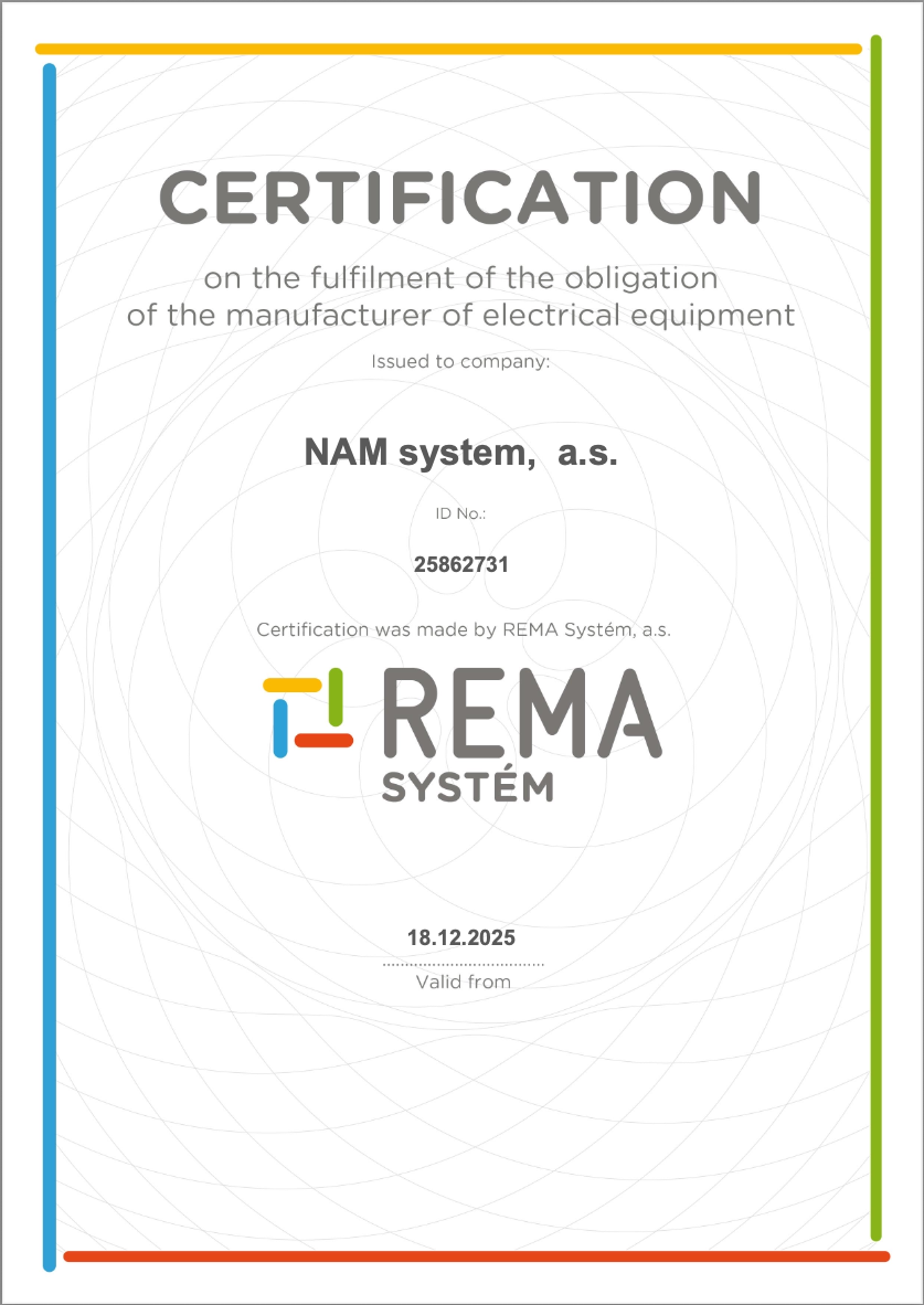 NAM system, a.s. is a member of the REMA System collective scheme and complies with the legal obligations of electrical equipment manufacturers regarding take-back and recycling of electronic waste, in accordance with applicable legislation in the Czech Republ